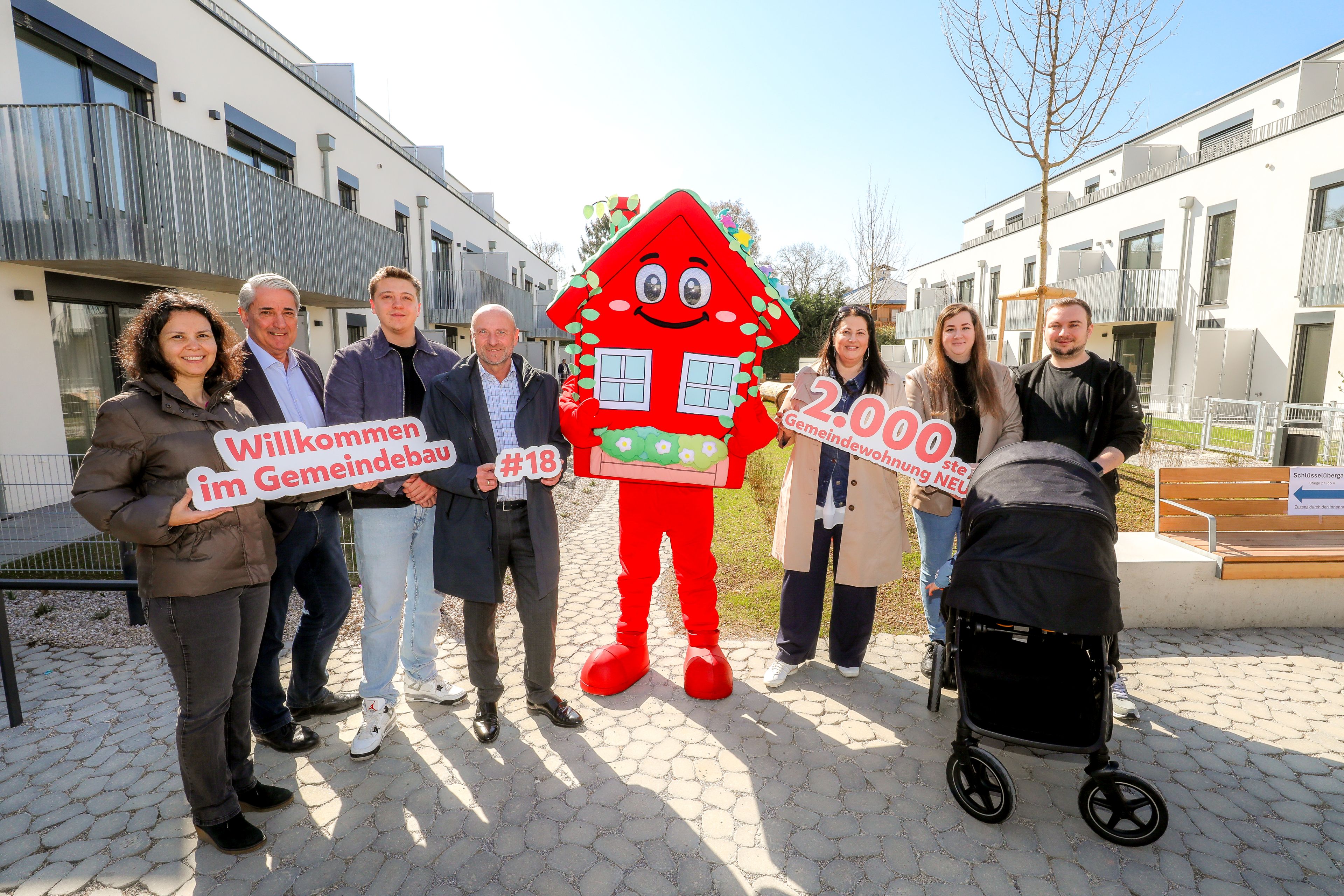 Sieben Personen stehen im Innenhof einer Wohnhausanlage. Die Anlage ist neu und hat drei Geschoße. In der Mitte der Gruppe steht das Maskottchen des Wiener Wohnbaus, Wohna Lisa. Sie ist ein rotes freundlich dreinblickendes Haus mit Satteldach auf zwei Beinen. Die Personen halten die Schriftzüge "Willkommen im Gemeindebau", "#18" und "2.000ste Gemeindewohnung NEU" in der Hand. Vor zwei Personen steht ein Kinderwagen.