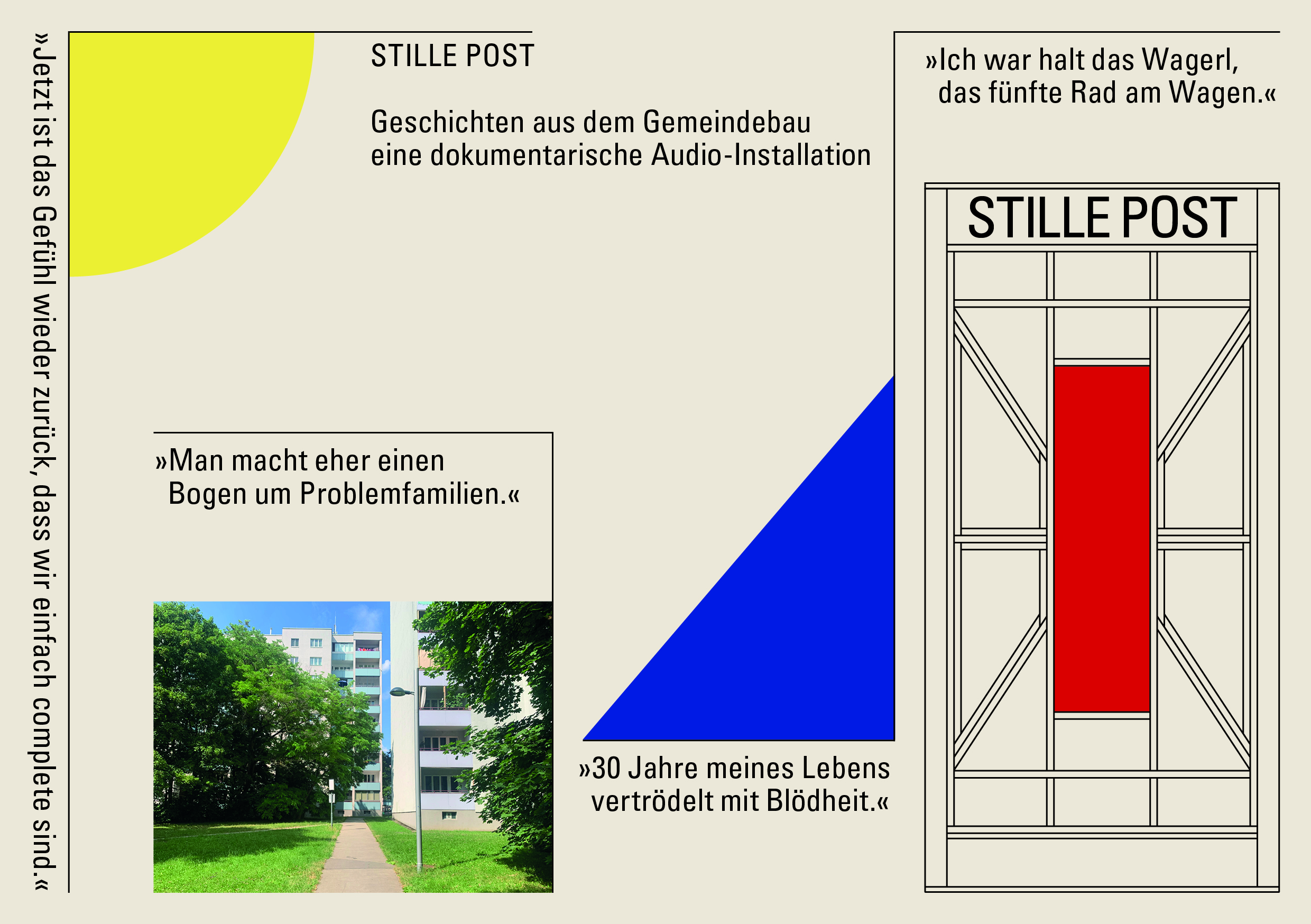 Stille Post ist eine Audio-Installation der Künstlerin Laura Andreß über zwischenmenschliche Beziehungen und Kommunikation im Gemeindebau. In zwei von 5. September bis Ende November öffentlich zugänglichen Telefonzellen geht es um privaten und öffentlichen Raum, um Gemeinschaft und Individualität.